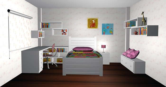 - Elementos: Cama con cabecero dibujado, mesita de noche, baúl, estanterías y escritorio